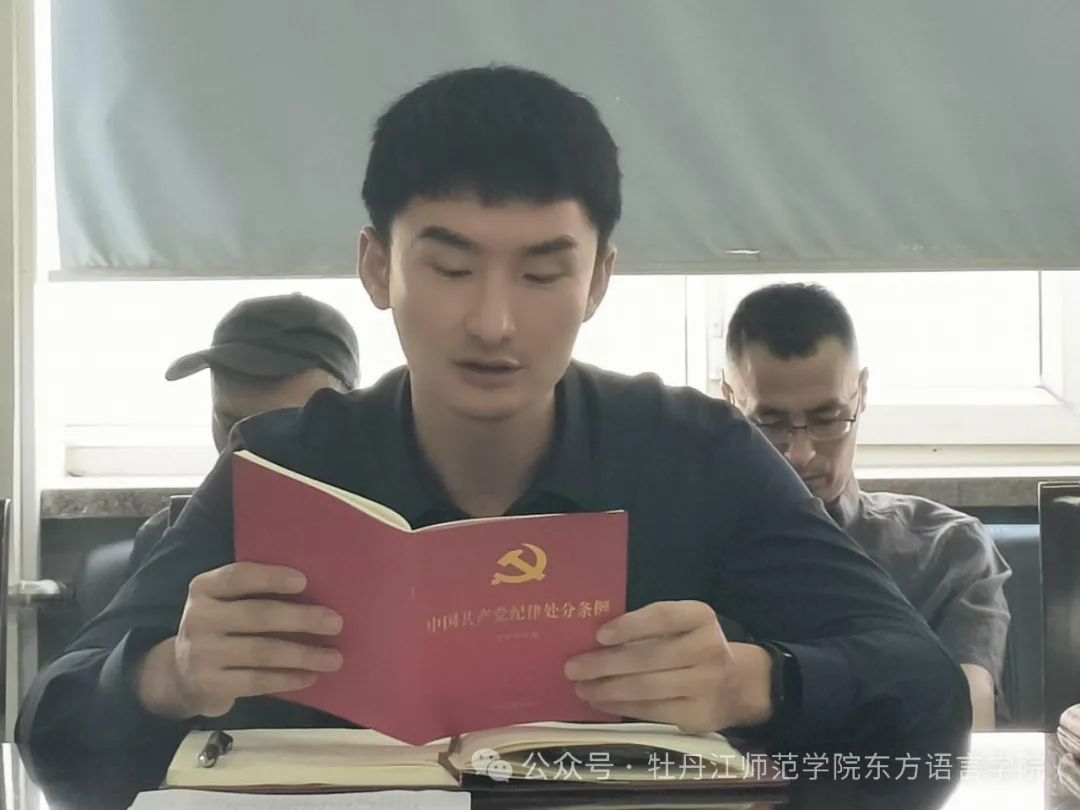 会议第一项,由周英会同志领学习近平总书记在中央全面依法治国工作会议上发表的重要讲话,房国铮同志领学习近平总书记在中共中央政治局第十四次集体学习时的重要讲话精神,张秋实同志领学《中国共产党纪律处分条例》,董奎玲同志领学习近平总书记主持召开新时代推动东北全面振兴座谈会上的重要讲话,张大程同志领学习近平总书记在《求是》杂志第11期发表的文章:发展新质生产力是推动高质量发展的内在要求和重要着力点,郭娉婷同志领学《中华人民共和国爱国主义教育法》。