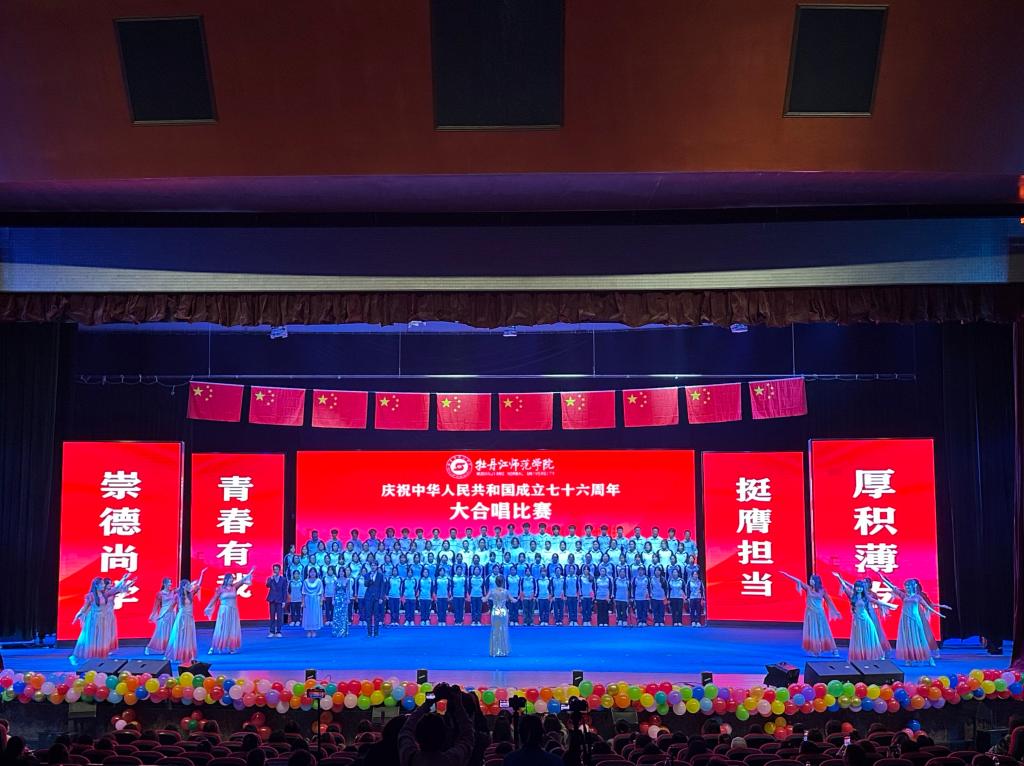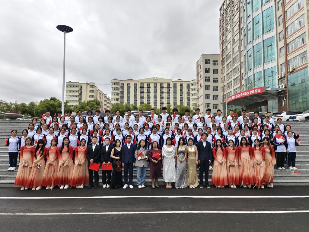 首支合唱曲目《神圣的使命》作为校歌,承载着“大荒地里铸就的精神永恒”的校史记忆,“让每颗燃烧的烛光,都点亮满天群星”的歌词经由2025级新生们嘹亮的歌声传递,将师院人“为教育事业献忠诚”的誓言融入旋律,彰显了代代传承的教育初心。随后,《天耀中华》的旋律缓缓响起。“风雨压不垮,苦难中开花”的歌词饱含力量,新生们的合唱层次分明,时而深情婉转,时而激昂高亢。小提琴的旋律穿插其间,与灵动的伴舞相映成趣,将对祖国“平安昌盛,生生不息”的真挚祈愿展现得淋漓尽致,唤起全场观众的情感共鸣。整场演出通过合唱、朗诵、器乐、舞蹈的多元融合,将爱党爱国情怀与校情校史深度联结,每一个音符都呼应着红色心向党的主题,每一段旋律都诉说着对中华的深情。