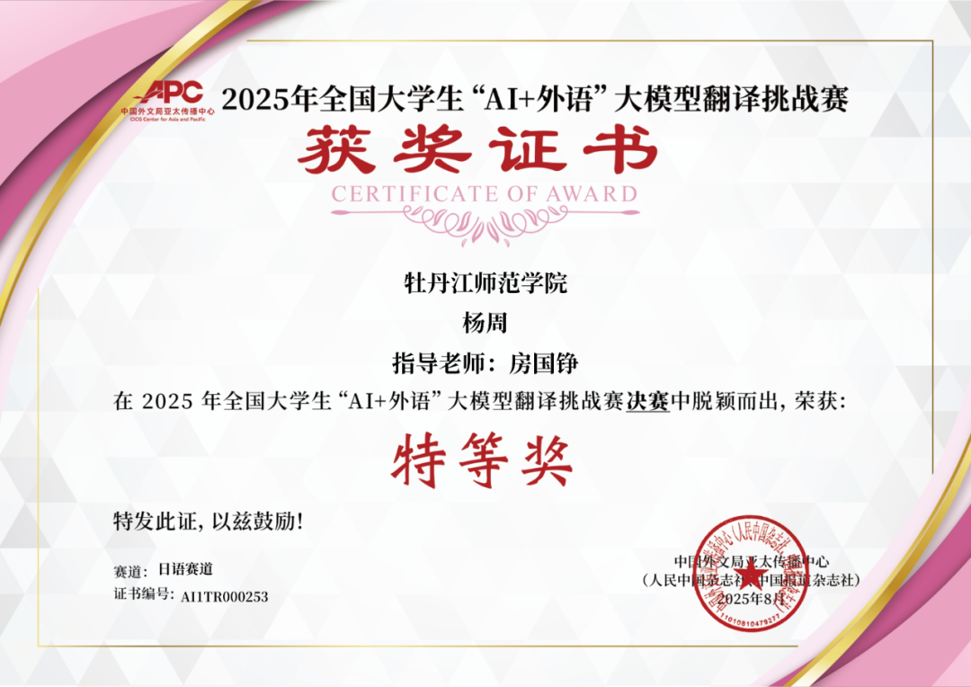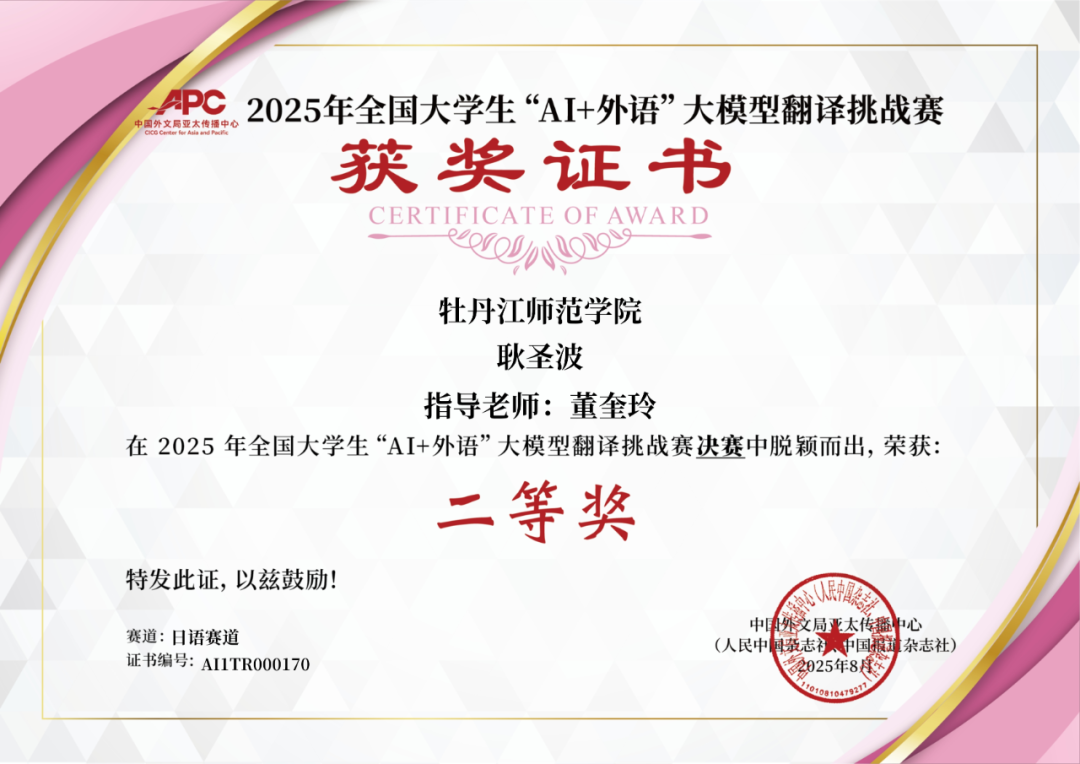 近日,由中国外文局亚太传播中心(人民中国杂志社、中国报道杂志社)主办的2025年全国老员工“AI+外语”大模型翻译挑战赛圆满落幕。经过激烈角逐,公司杨周同学荣获日语赛道特等奖;谭璐、耿圣波同学获日语赛道二等奖;陈贵云同学获日语赛道三等奖,获奖数量实现新突破。